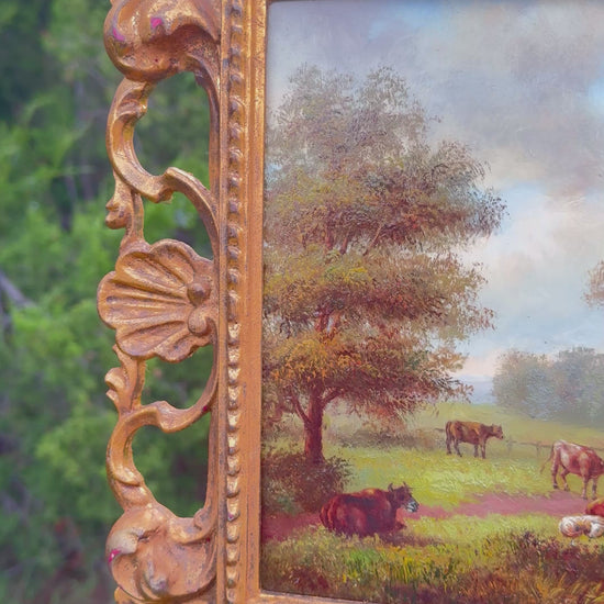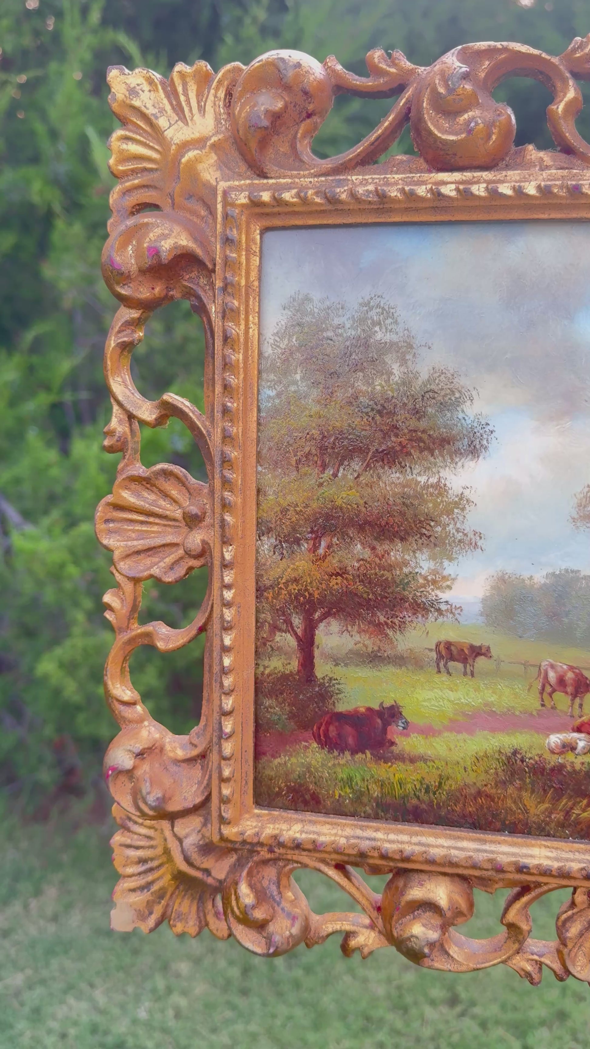 Lovely scenic cow landscape oil painting in ornate wood gold frame. This lovely painting will elevate any space. Measures 13.5" H by 16" W.