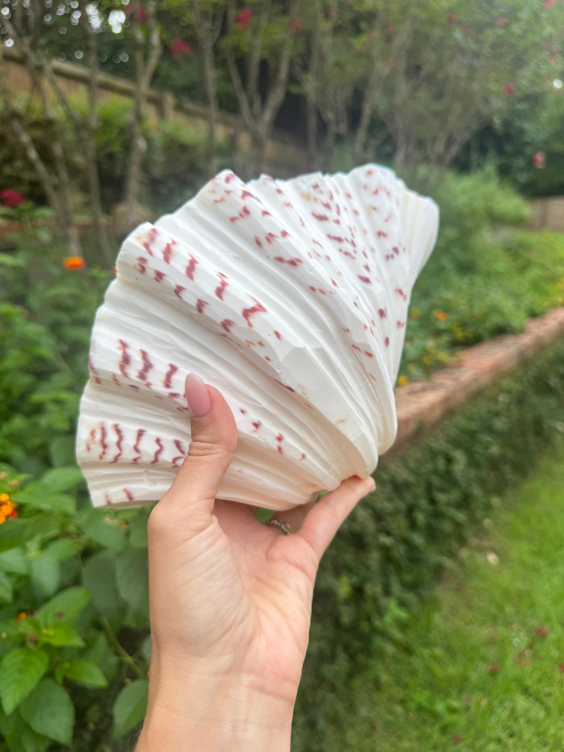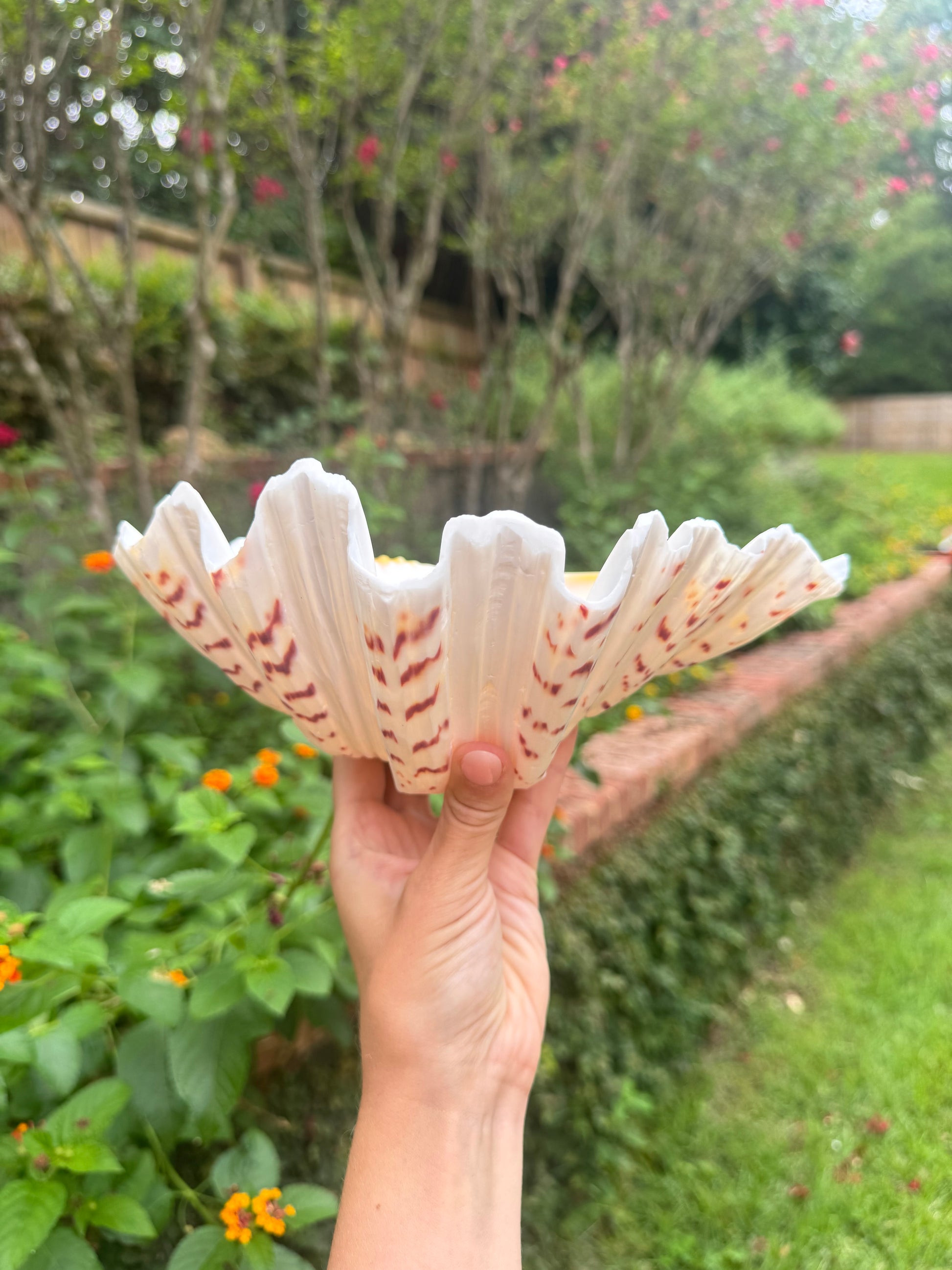 Overview: A real clam shell with brown striations that add a touch of color and design.