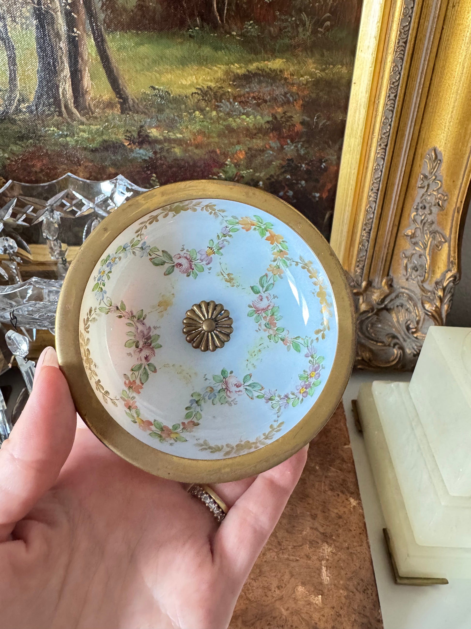 Overview: Beautiful set of opaline with hand-painted floral garlands in soft pink, green and gold tones. Each rests on an ornate gilt bronze acanthus base - classic of the Napoleon III era.